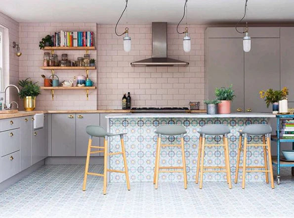 A very cheerful theme with this gorgeous kitchen by the super talented "Two Lovely Gays". They used our encaustic T146 in a bespoke pastel colourway.