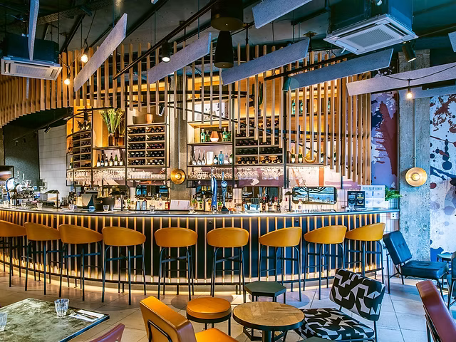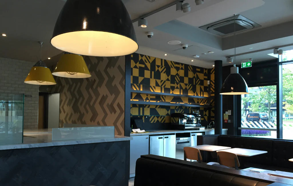 We were approached by Pizza Express to produce 110m2 of our geometric cement encaustic tiles, a bespoke patchwork of encaustic tiles and our Picasso Cube porcelain tiles across a number of their restaurants. All of the designs look fab, however the show stopper is still Manchester's First Street Pizza Express for their radical black and yellow design, taking inspiration from a roll of hazard tape!