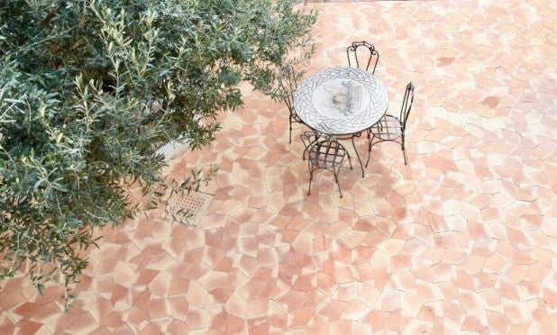 Terracotta petals can be framed with contrasting shapes or mixed with other formats to create patterned floor and wall compositions.