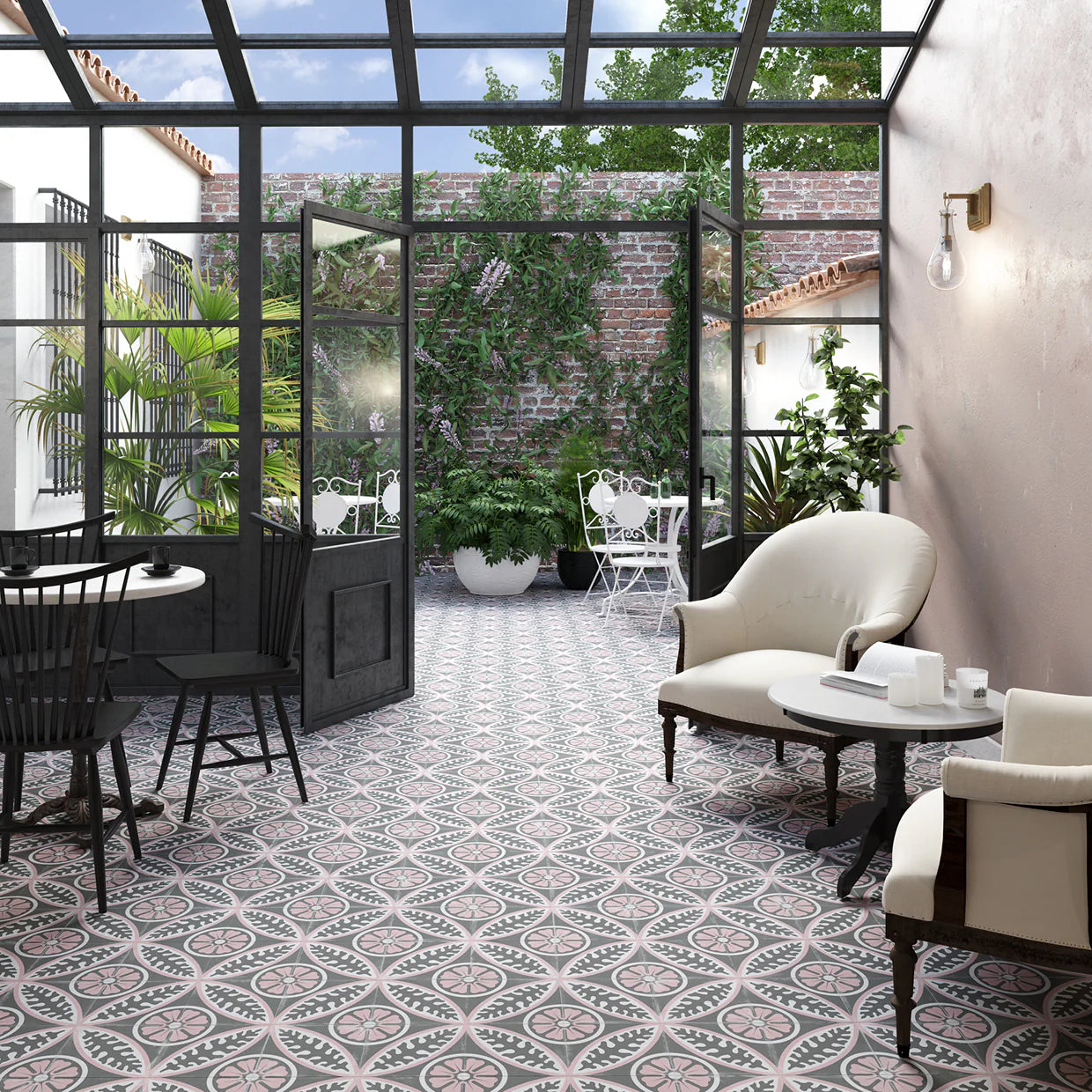 | Porcelain | 59.2x59.2cm | Black, Pink, Off-white | Natural | 1cm | R10 | £57.50 | £69.00 |